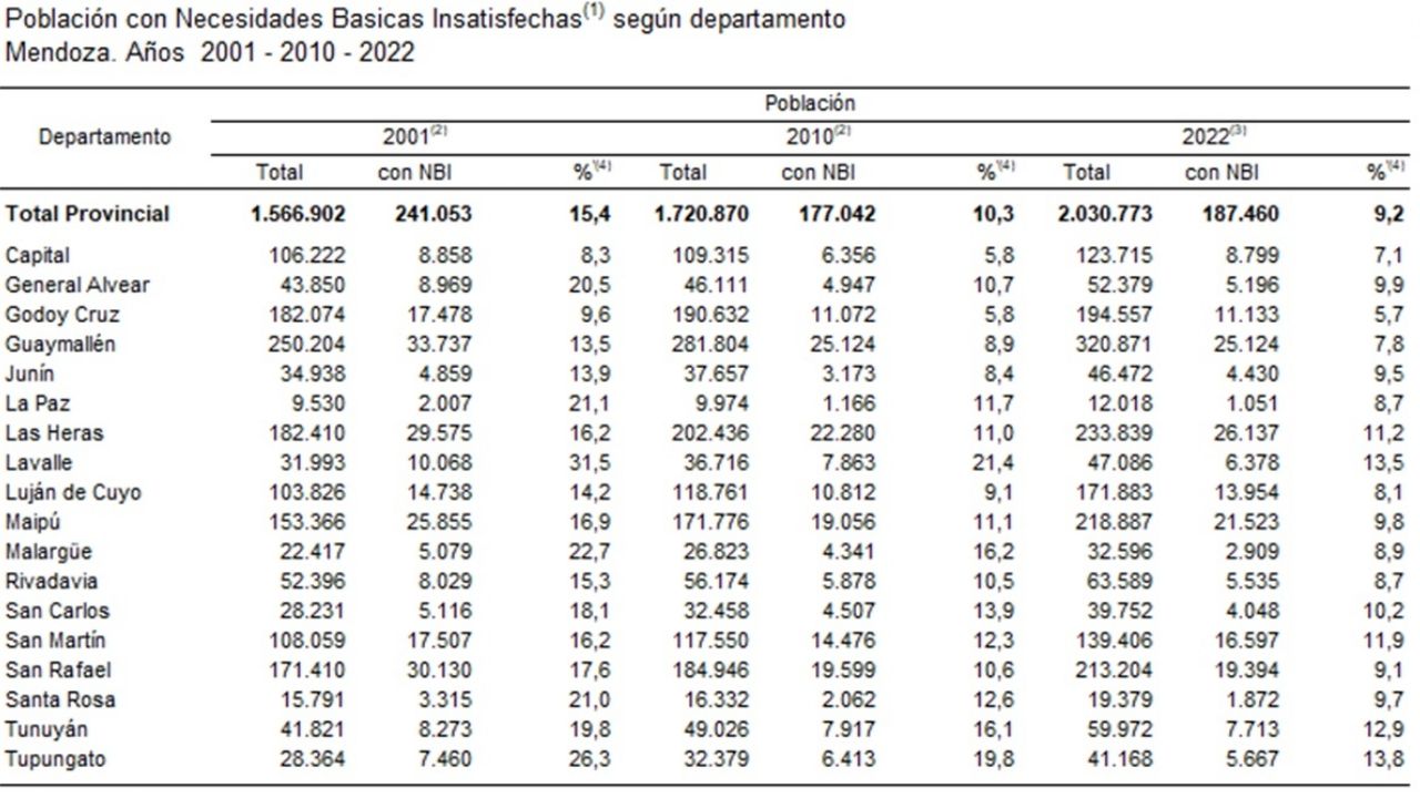 Bueno, Tupungato es el departamento de Mendoza en donde más Necesidades Básicas Insatisfechas hay, lidera el ranking con el 13,8% según la Dirección de Estadísticas e Investigaciones Económicas (DEIE) en base a los datos del Censo 2022.