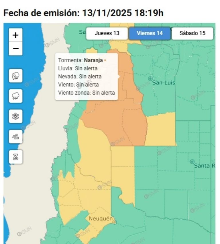 Para el viernes, el Servicio Meteorológico Nacional lanzó dos alertas por tormentas para la provincia. Una amarilla para en Malargüe y el Noroeste de Mendoza y una alerta naranja para el centro y Este de Mendoza.