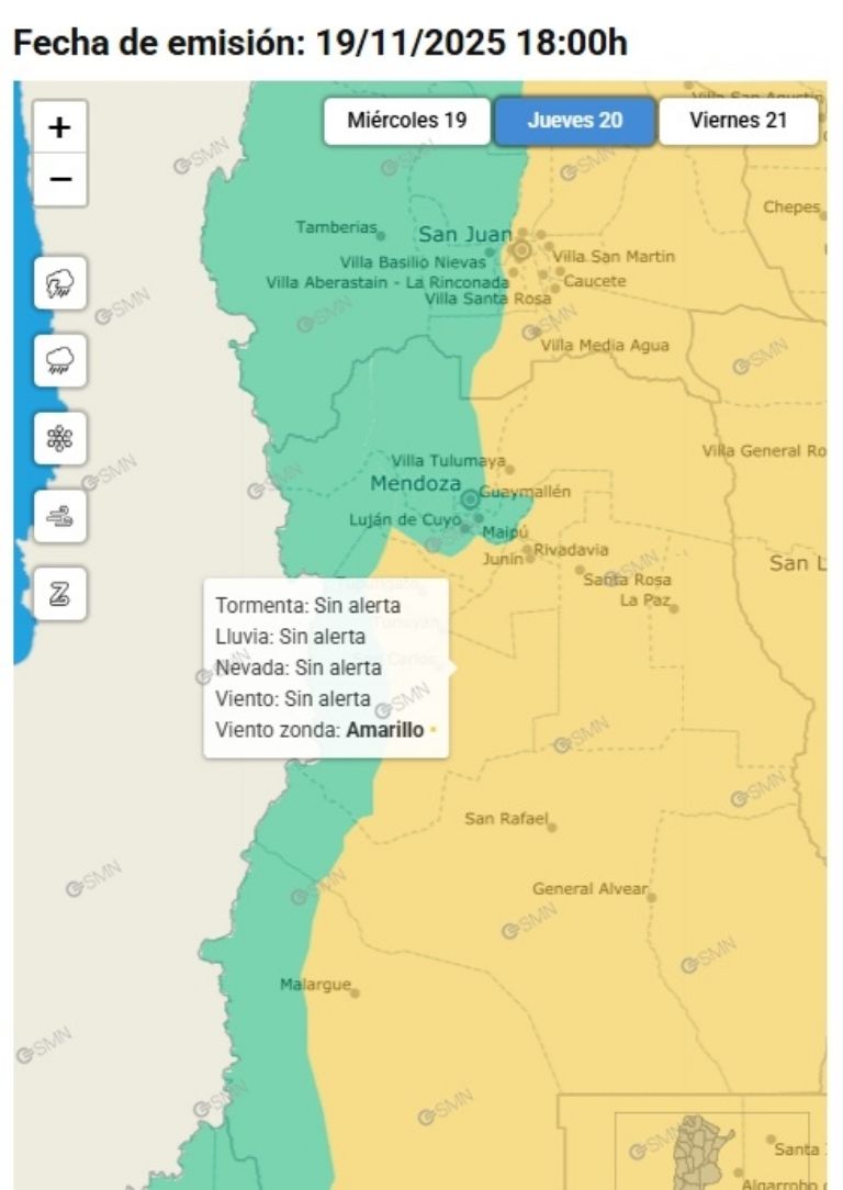 En tanto, el Servicio Meteorológico Nacional lanzó dos alertas amarillas para la provincia. Una por vientos fuertes en el Este y otra alerta, también amarilla, por Zonda en el Sur y Valle de Uco.
