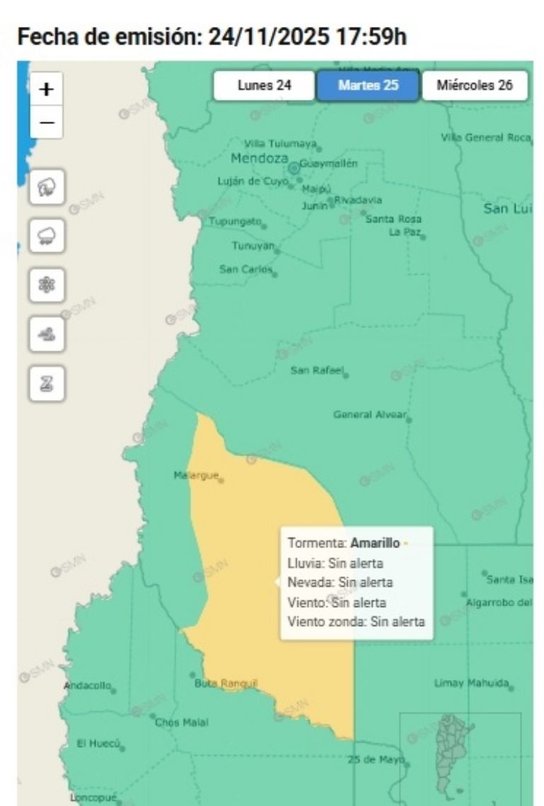El Servicio Meteorológico Nacional lanzó una alerta amarilla por tormentasen el Sur de la provincia. La misma abarca a todo el departamento de Malargüe.