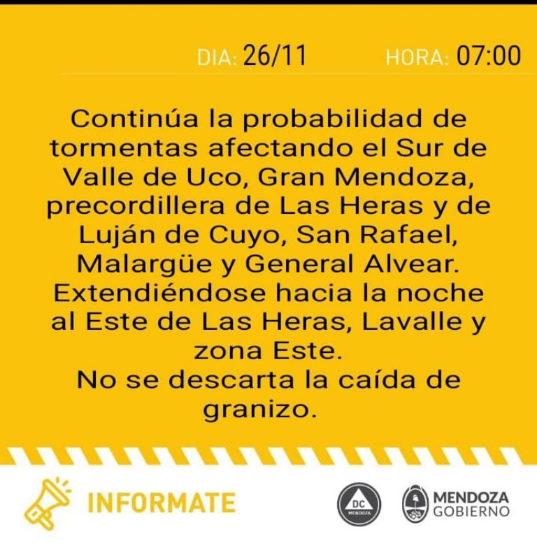 Además, el día será caluroso, con una temperatura mínima que rondó los 20° y se espera una máxima que podría alcanzar los 37° o incluso los 38° en algunos puntos, sumando una alerta amarilla por calor extremo en zonas como el este de Las Heras y Lavalle.