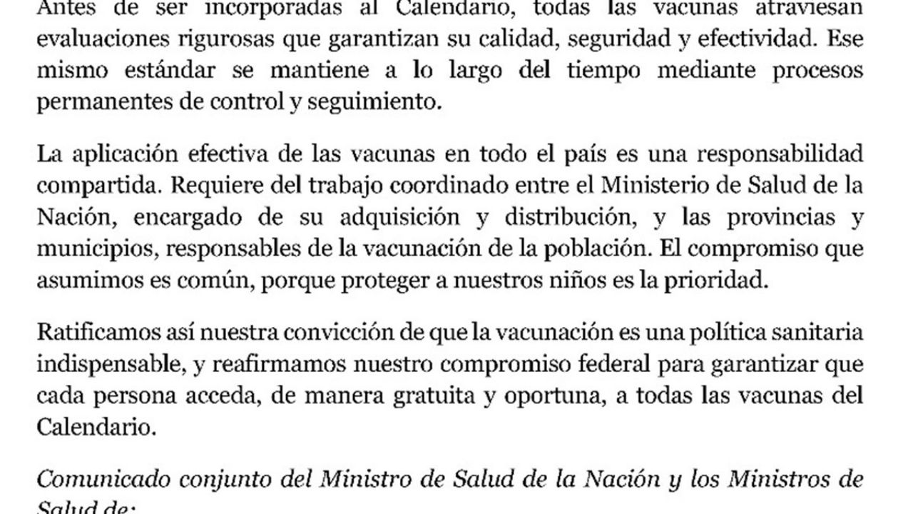 El escrito fue firmado por los ministros de Salud de todas las jurisdicciones, con excepción de Buenos Aires y Formosa, y ratifica un posicionamiento federal en medio de la caída de coberturas y del incremento de mensajes desinformativos en redes sociales, y luego del escándalo y papelón en el Congreso de la Nación con un congreso, valga la redundancia, antivacunas.