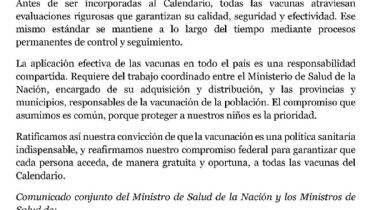 El mensaje remarcó que la vacunación es una política sanitaria “indispensable” y una responsabilidad compartida entre Nación, a cargo de la adquisición y distribución, así como de las provincias y municipios, responsables de la aplicación: “El compromiso es común, porque proteger a los niños es la prioridad”.