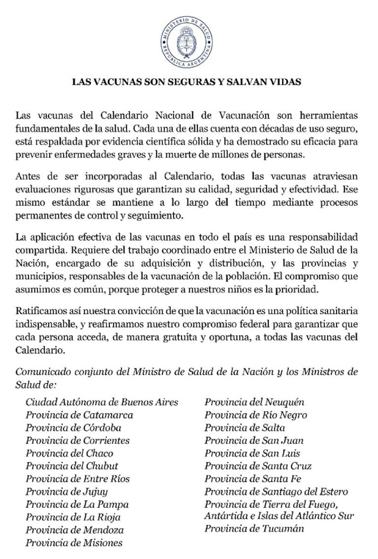 El Ministerio de Salud y las carteras sanitarias de 22 provincias difundieron un comunicado conjunto en defensa de las vacunas y del Calendario Nacional de Vacunación, en el que reafirmaron la seguridad, eficacia y necesidad de las vacunas frente al avance de discursos negacionistas.