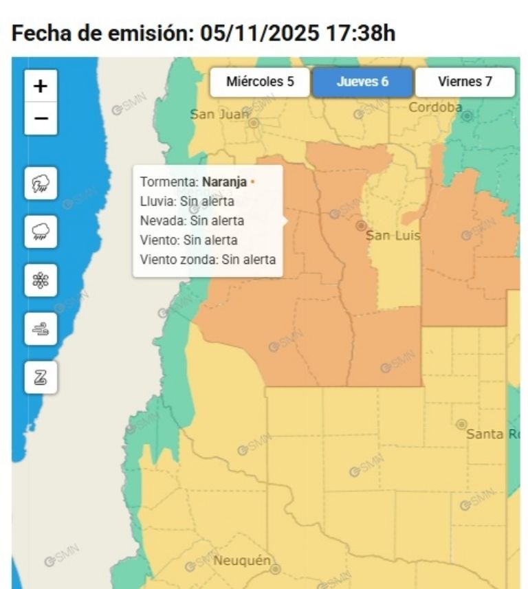 En tanto, el SMN lanzó tres alertas para la provincia. Una amarilla por Zonda en el Noroeste, alerta naranja por tormentas en el Este, Centro y Sur de la provincia y una alerta amarilla por tormentas en Malargüe.