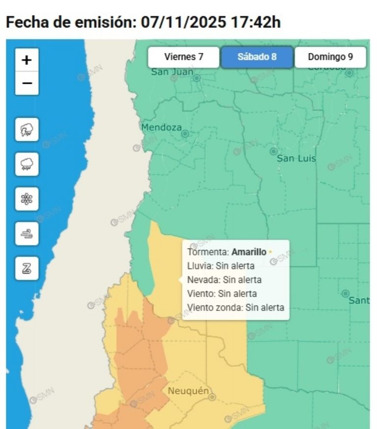 En tanto, el Servicio Meteorológico Nacional lanzó una alerta amarilla por tormentas en Malargüe para el sábado y una alerta amarilla, también por tormentas, para domingo que abarca Malargüe, San Rafael y Alvear.