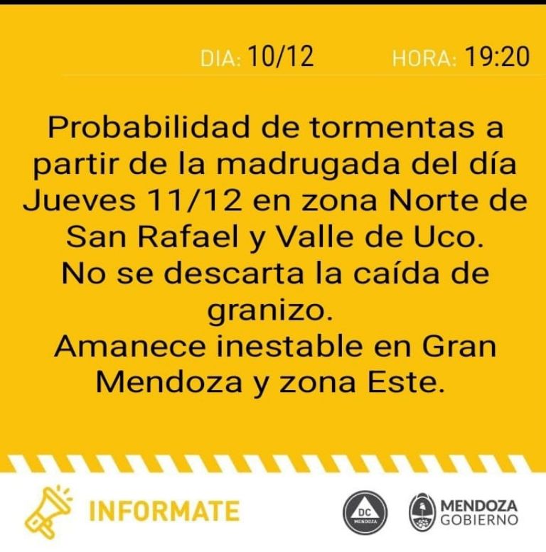 En la tarde de este miércoles, la Dirección de Defensa Civil emitió una alerta amarilla para Mendoza. “Probabilidad de tormentas a partir de la madrugada del jueves en zona Norte de San Rafael y Valle de Uco”, advirtió el organismo.