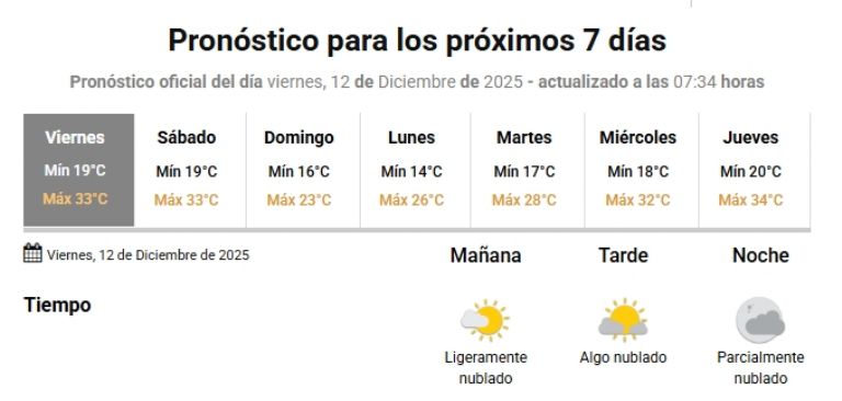 El pronóstico del tiempo para este viernes indica poca nubosidad y vientos moderados provenientes del noreste. Las condiciones en general se presentarán con una mejora respecto a días anteriores, garantizando un día soleado en gran parte del territorio.