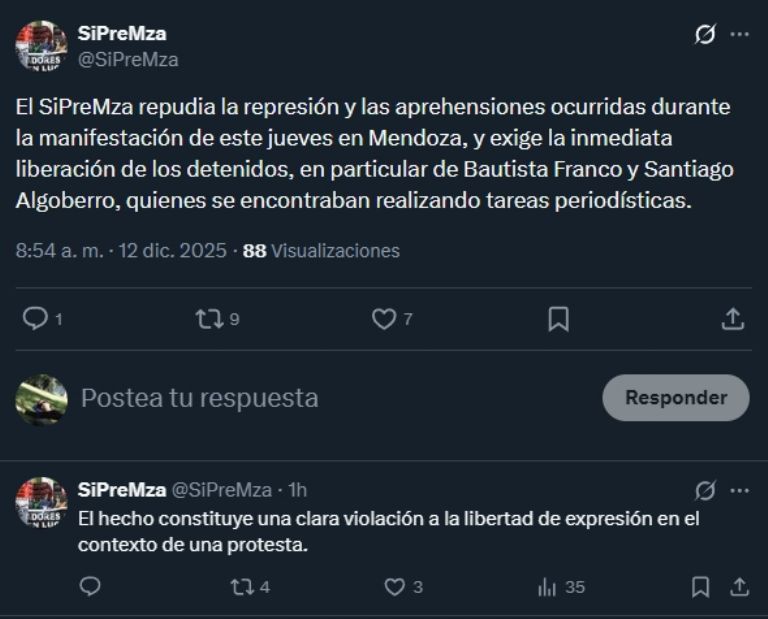 Por su parte, el Sindicato de Prensa de Mendoza denunció que dos periodistas también fueron detenidos en el momento que estaban filmando la manifestación.