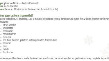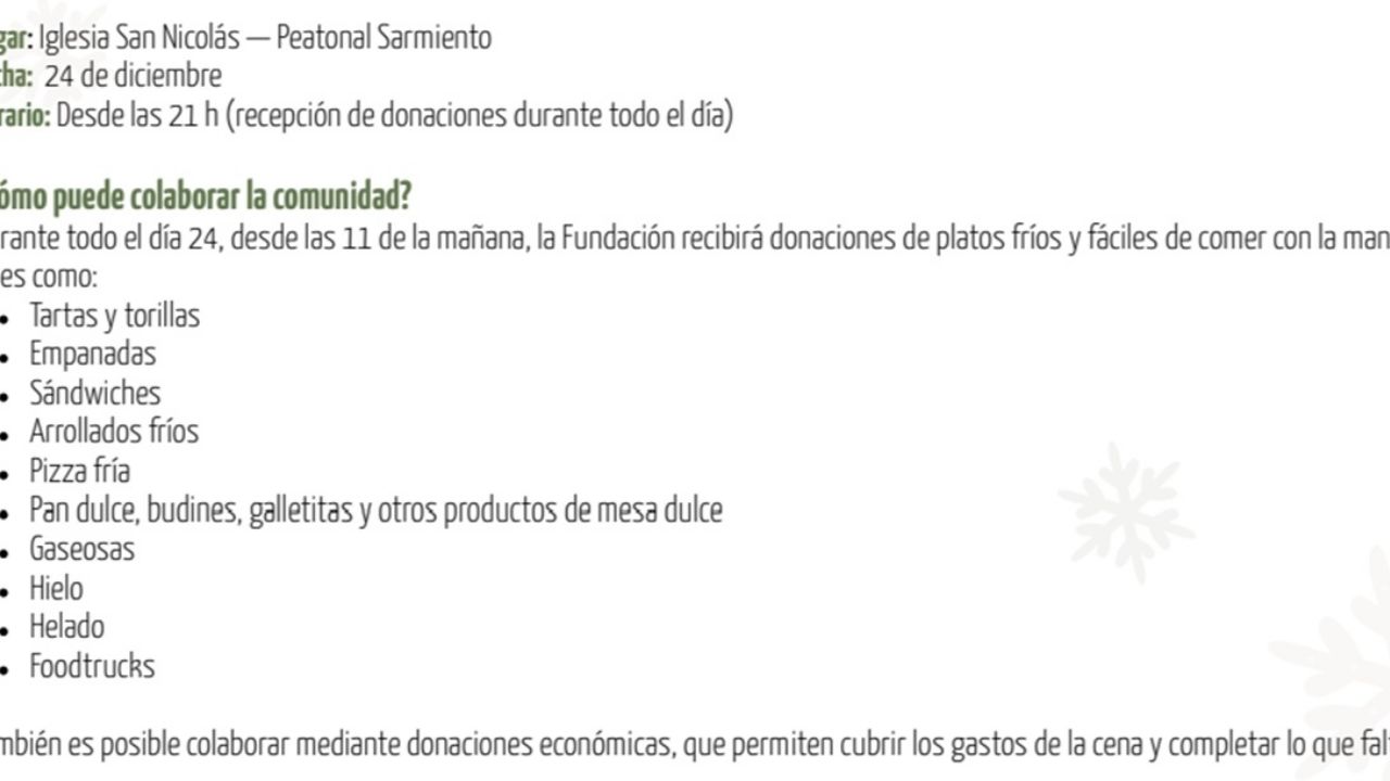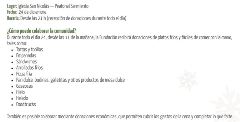 "Está abierto a la comunidad, no es un festejo cerrado. Se hace frente a la iglesia San Nicolás y recibimos todo tipo de donaciones debido a que es un evento muy grande y no podemos con nuestros recursos organizar un evento tan grande. Así que estamos recibiendo donaciones de todo tipo, sobre todo alimentos fríos que se puedan comer con la mano, como por ejemplo: arrollados, pizza fría, sanguches. Recibimos ese mismo día desde las 10 de la mañana en la iglesia de San Nicolás. También recibimos bebidas sin alcohol, elementos de limpieza descartables, pan dulce, budines para poder armar una mesa dulce. Todo eso lo vamos a estar recibiendo los días previos y ese mismo día desde las 10 de la mañana".
