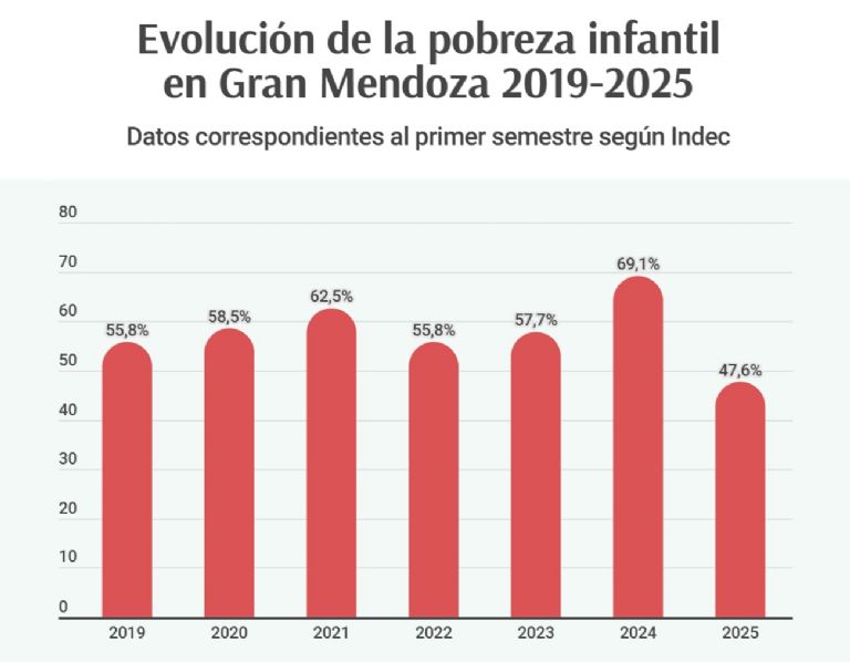 La pobreza infantil bajó en Mendoza entre el primer semestre del 2024 y el mismo período del 2025 del 69,1 al 47,6; el porcentaje más bajo de los últimos seis años. Concretamente bajó 21,5 puntos y salieron de esa situación 51.591 niños de entre 0 y 14 según los indicadores del Indec realizados en base a la base de microdatos de la Encuesta Permanente de Hogares.