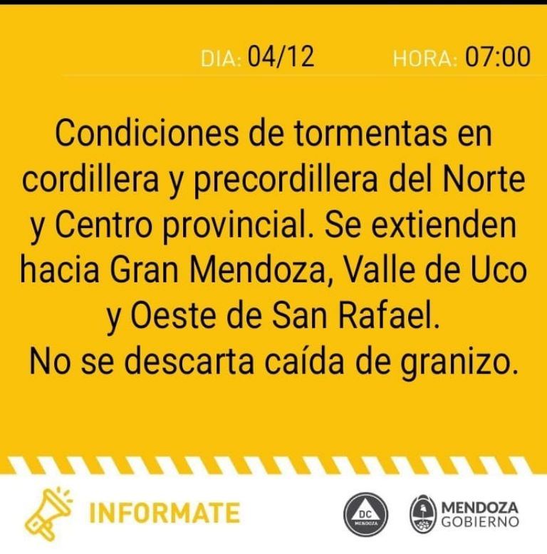 Las zonas más afectadas por la alerta amarilla incluyen, según los reportes, al Gran Mendoza, el Valle de Uco y el Este de la provincia.