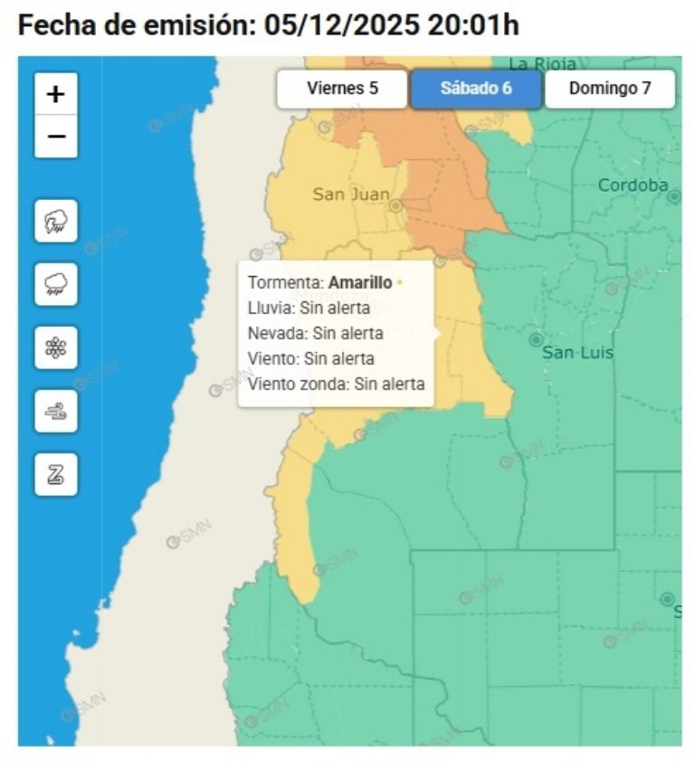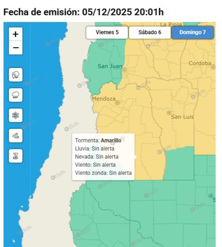 Para el domingo, el SMN extendió la alerta amarilla por tormentas hasta el Sur. La misma abarcaría Valle de Uco, Gran Mendoza, el Este provincial, General Alvear y San Rafael.