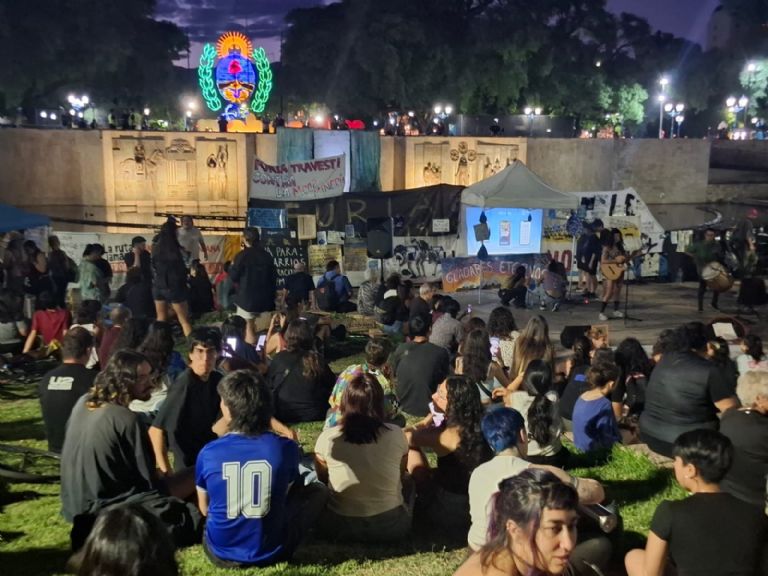 Anoche tanto la Peatonal Sarmiento como la Plaza Independencia estaban con la cantidad de gente habitual y con mucha tranquilidad, solo se escuchaban las canciones que cantaban los músicos que habían llegado para solidarizarse con la protesta antiminera y las consignas contra San Jorge cuando algún referente tomaba el micrófono.