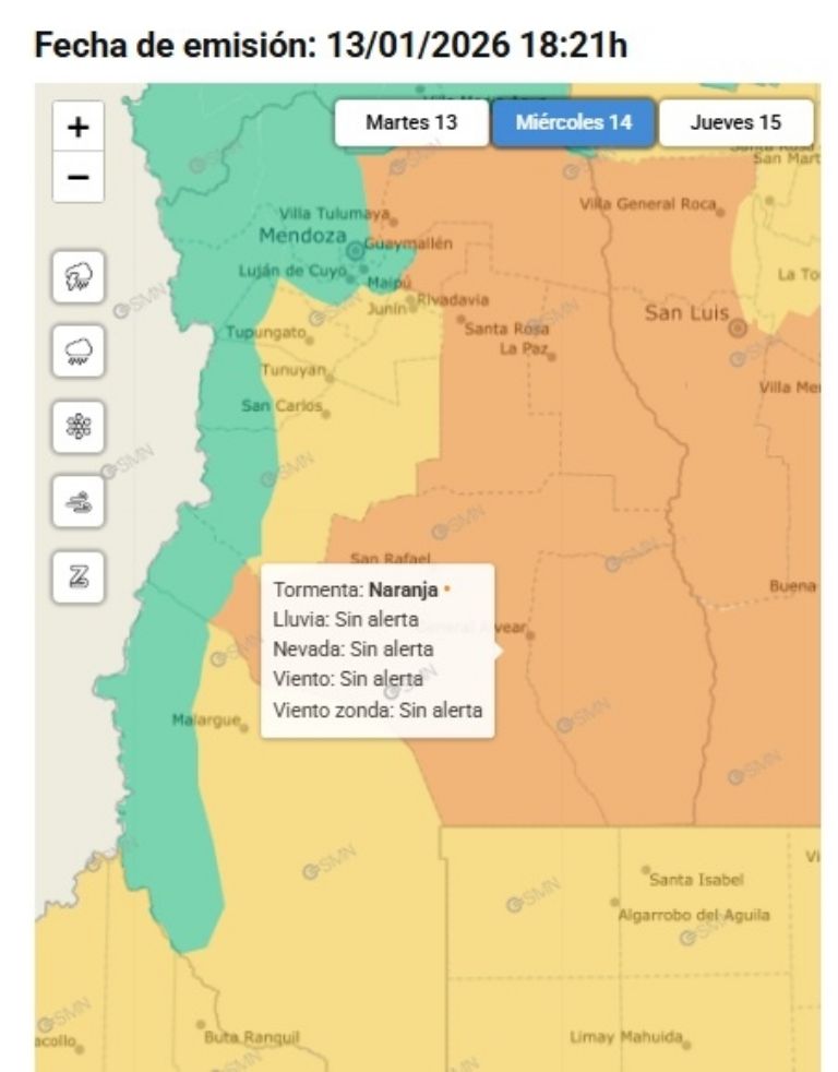 El Servicio Meteorológico Nacional lanzó dos alertas por tormentas para la provincia. Una amarilla para el Valle de Uco y Malargüe y otra naranja para el Este, San Rafael y Alvear.
