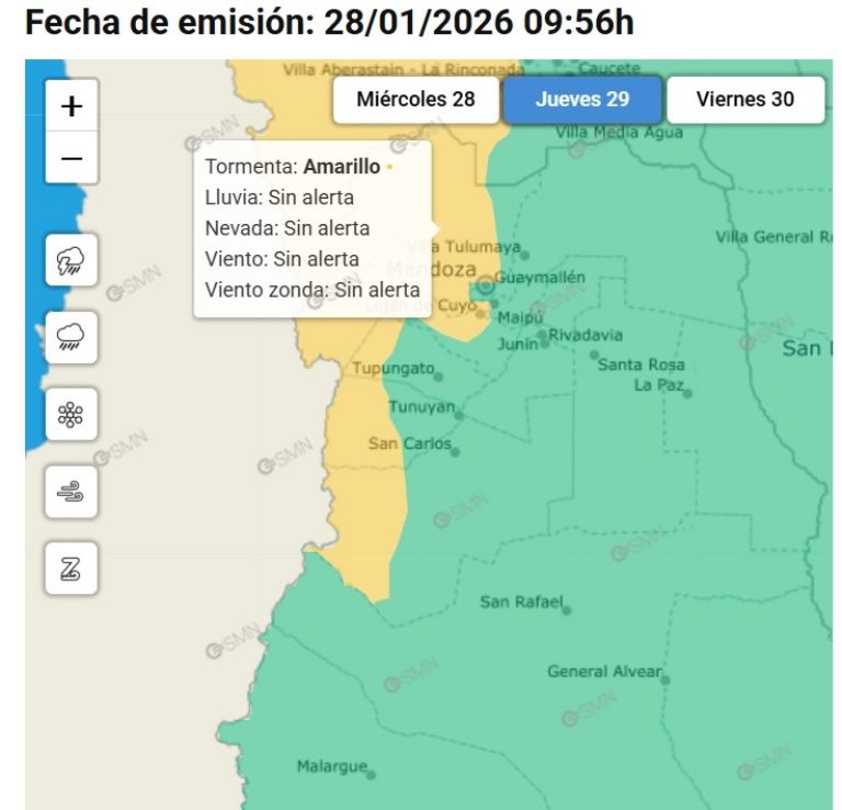 En tanto, el SMN lanzó una alerta amarilla por tormentas para algunas zonas de la provincia. La misma abarca a parte del Valle de Uco, la zona Norte de la Cordillera y parte del Gran Mendoza.