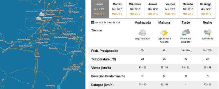 - Dirección de Contingencias Climáticas (Mendoza): el ente local es el más contundente al pronosticar una máxima de 35°C y una mínima de 19°C. Define el día como "muy caluroso con nubosidad variable" y lanza una advertencia clave: probabilidad de tormentas hacia la noche, acompañadas de vientos moderados del noreste.