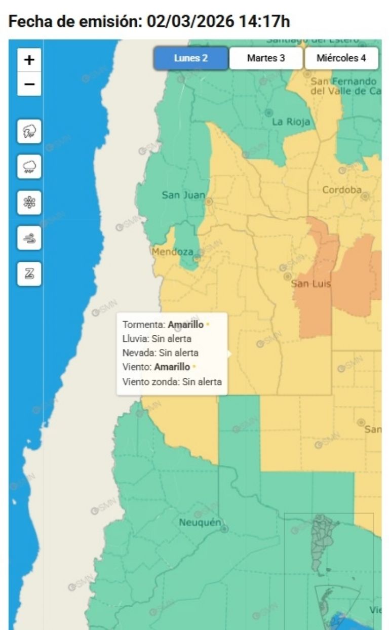 El Servicio Meteorológico Nacional mantenía tres alertas amarillas para Mendoza. Una por viento Zonda en Malargüe, una por vientos fuertes en el Sur, Centro y Este de la provincia y una por tormentas que alcanza todo los departamentos, menos Las Heras y Malargüe.