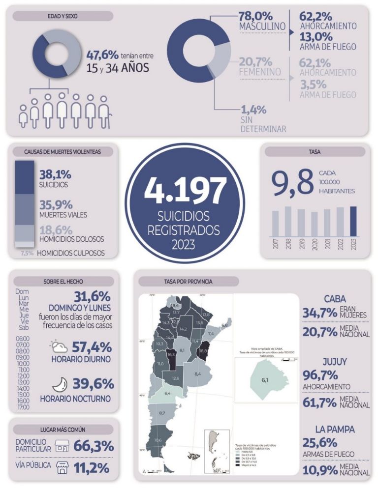 En Mendoza, desde hace varios años en la provincia funciona un Observatorio de Salud Mental donde procesan los datos sobre suicidios. De la información recopilada en los últimos cuatro años se desprende que la tasa de suicidio ha ido en aumento desde el 2021, que en 2024 la edad promedio fue de 40 años y el 77% de los casos corresponde a varones.