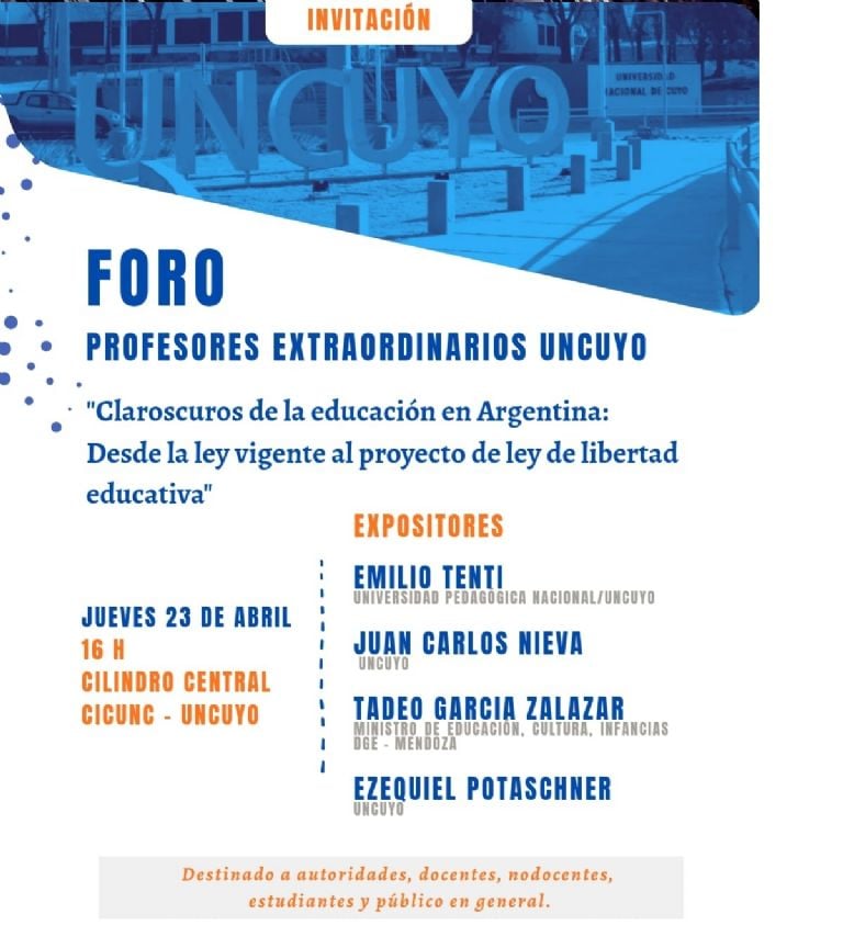 Emilio Tenti Fanfani, Juan Carlos Nieva y Ezequiel Potaschner, debatirán junto al ministro de Educación Tadeo García Zalazar sobre los Claroscuros de la educación en Argentina.Desde la ley vigente hasta el proyecto de ley de libertad educativa.