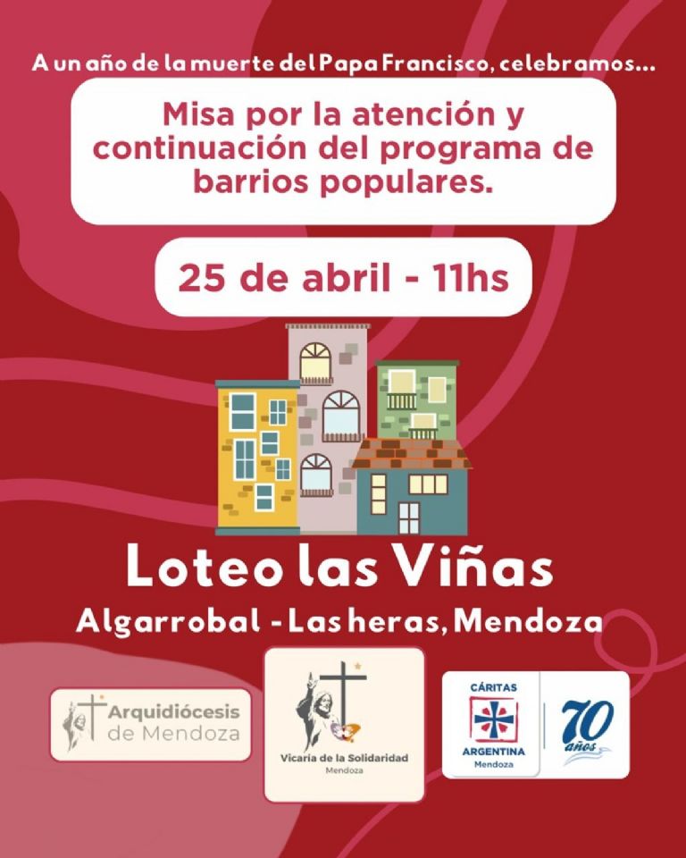 Es por esto que desde la Arquidiócesis de Mendoza, la Vicaría de la Solidaridad de Mendoza y Cáritas Mendoza, decidieron realizar una misa el sábado 25 de abril a las 11 horas en el Loteo Las Viñas, en El Algarrobal, departamento de Las Heras, por la atención y continuación del programa de Barrios Populares.