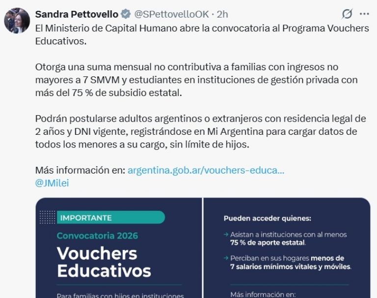 Desde el área que comanda Pettovello señalaron que la iniciativa busca acompañar a las familias en el sostenimiento de la escolaridad en el sector privado subsidiado, en el marco de las políticas educativas impulsadas por el Gobierno nacional.
