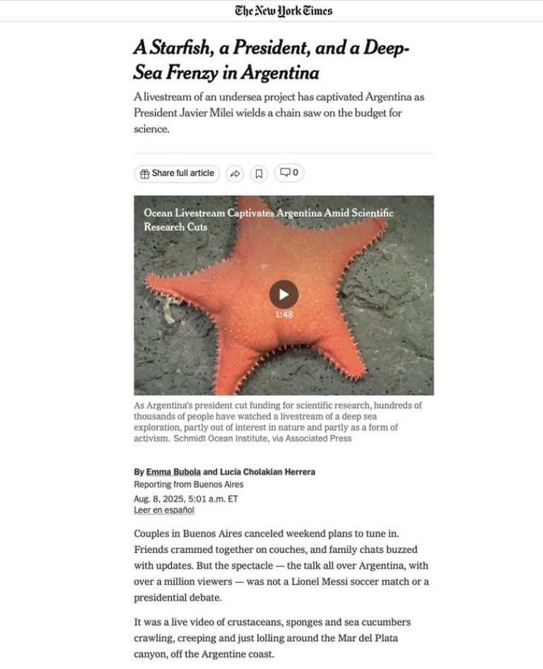 Un insólito protagonista marino ha captado la atención del mundo, saltando de las profundidades del Mar Argentino a las páginas de The New York Times. La "estrella culona", nombre coloquial de una especie de equinodermo, es la nueva estrella de un artículo que va mucho más allá de la biología marina, y se adentra en el polémico debate sobre el financiamiento de la ciencia y tecnología en Argentina.